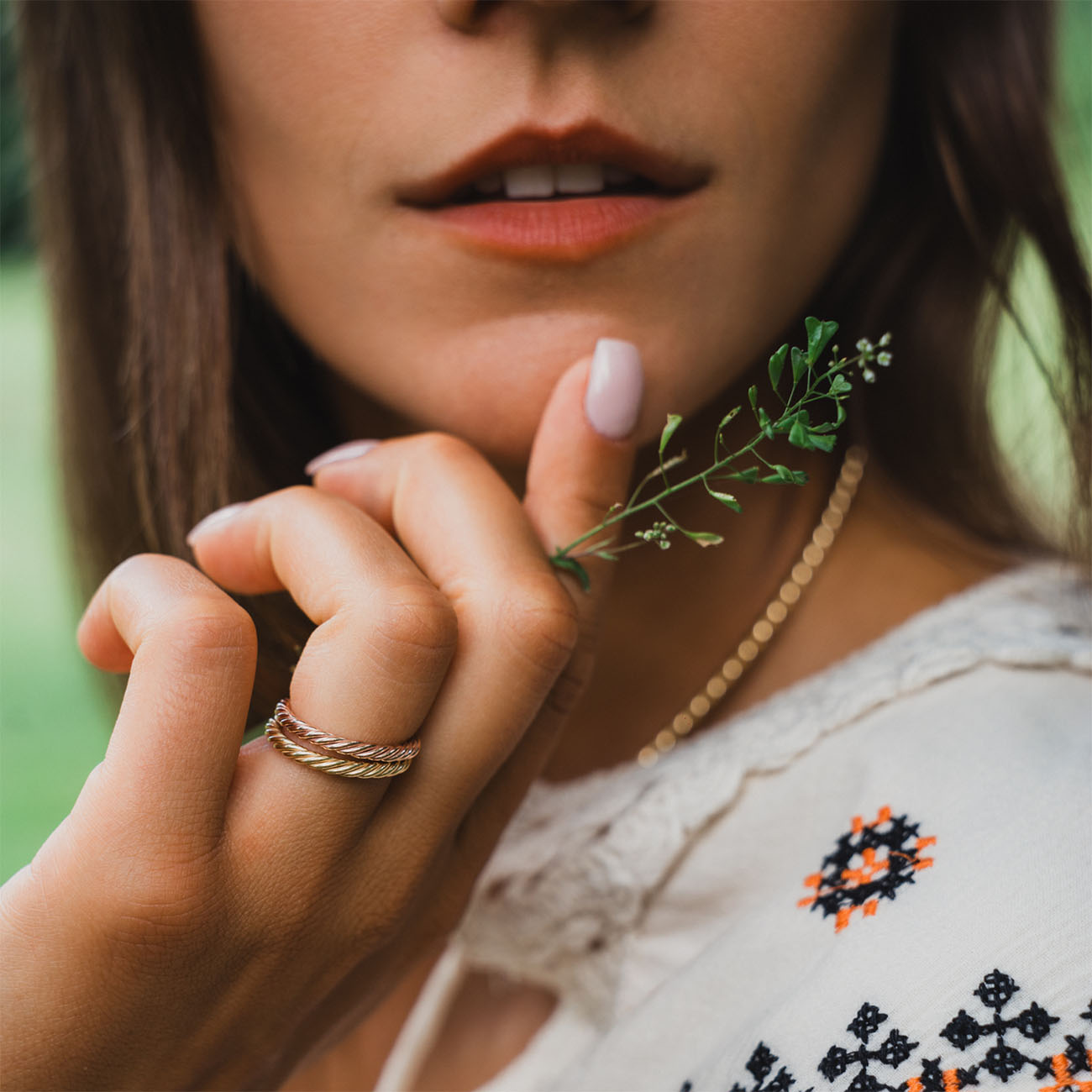 La bague tensorielle en or rose allie la force du cuivre à la délicatesse d'une couleur symbolisant l'amour et la gratitude. Considérée comme une amulette de protection, elle rappelle l'harmonie du cœur et la subtilité, qui est en même temps une source de force. C'est une proposition pour ceux qui souhaitent porter des bijoux uniques pleins de symbolisme – alliant beauté et signification spirituelle.
