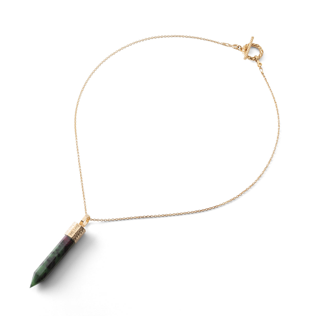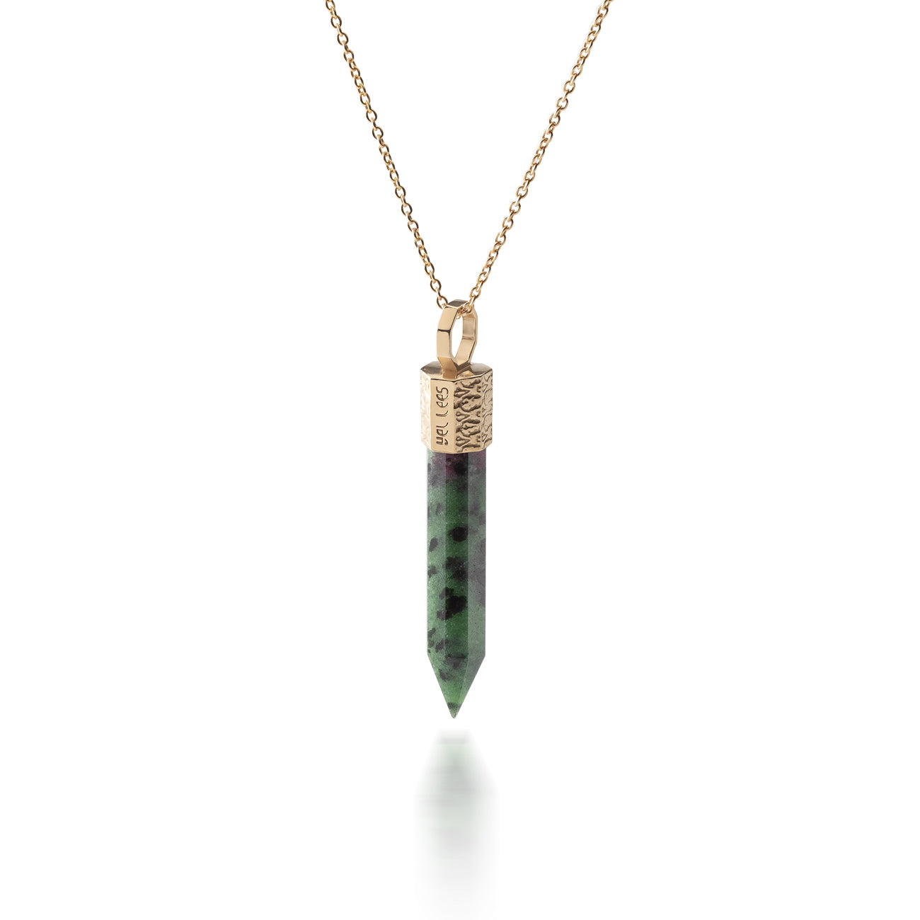 Naszyjnik z zoizytu z rubinem 44 mm ze srebra 925 pozłacanego z kolekcji TERRA 44 to kamień przemiany, pasji i odwagi. Łączy energię rubinu i zoizytu, tworząc harmonijny balans między spokojem a siłą działania. Idealny dla tych, którzy są w procesie wewnętrznego wzrostu i chcą żyć z sercem pełnym odwagi, miłości i świadomości.